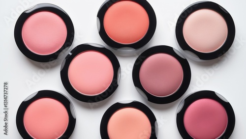 Coral blush and compact powder arranged on a white background. Isolated. Attractive colorful beauty template. Makeup. Cosmetic items. Flat lay.