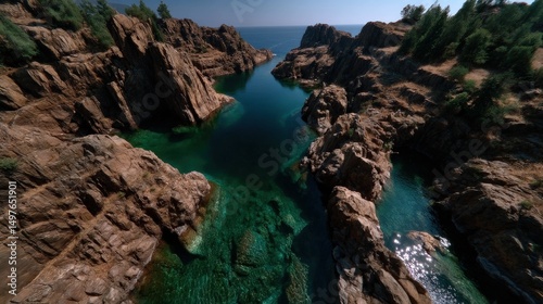Coral heads seen through transparent water, coastline, cliff, bay, blue, mediterranean, vacation, rocky