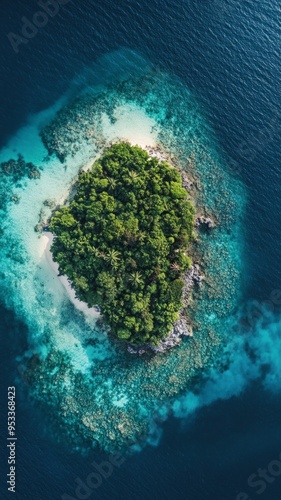 Coral Island Oasis, breathtaking aerial perspective showcasing a vibrant coral island surrounded by crystal-clear turquoise waters, highlighting nature's tropical beauty.
