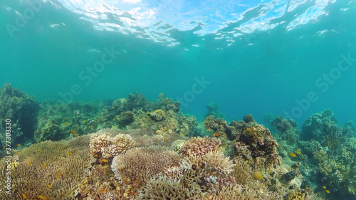 Coral reef underwater with fishes and marine life. Coral reef and tropical fish. Panglao, Bohol, Philippines.
