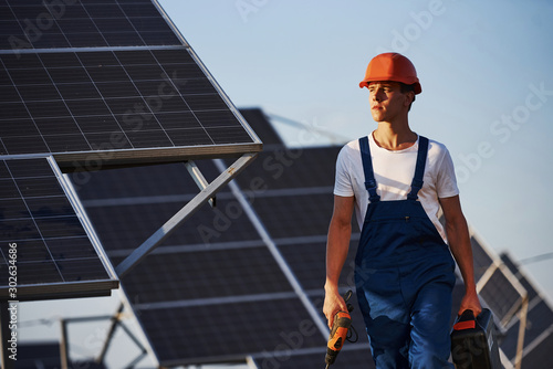 Cordless screwdriver in hand. Male worker in blue uniform outdoors with solar batteries at sunny day