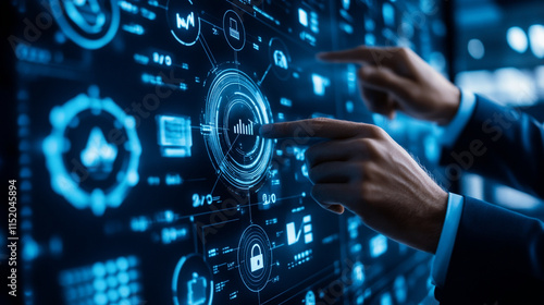 Core Values: Businessman touching connect to data information on cyberspace, trust, integrity, transparency, responsibility, innovation.