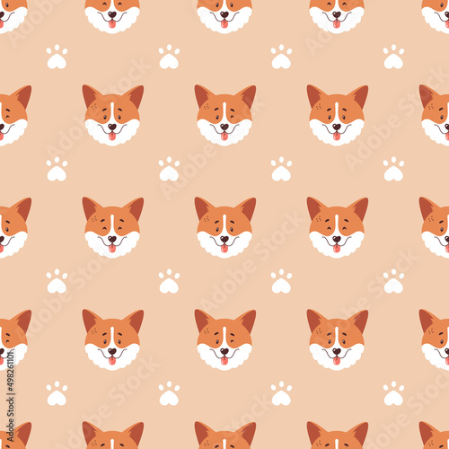 Corgi seamless pattern. Cute smiling welsh corgi faces and paw prints. Happy dog characters. Stylish vector background.