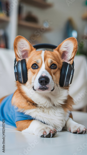 Corgi Wearing Headphones Relaxing in Soft-Focus Interior
