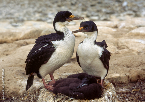 Cormoran impérial, nid, jeune, Leucocarbo atriceps , Imperial Shag, Iles Falkland, Malouines