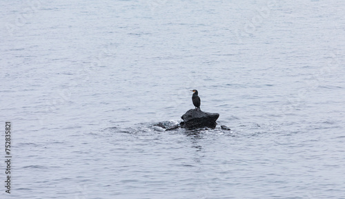Cormorant resting on a small reef on the coast. Japanese cormorant, Temminck's cormorant, Phalacrocorax capillatus