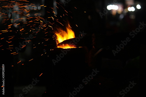 Corn being cooked on coal near beach with some fire spark . A corn roaster sparkling fire in the shores of Marina Beach, Chennai, India on night