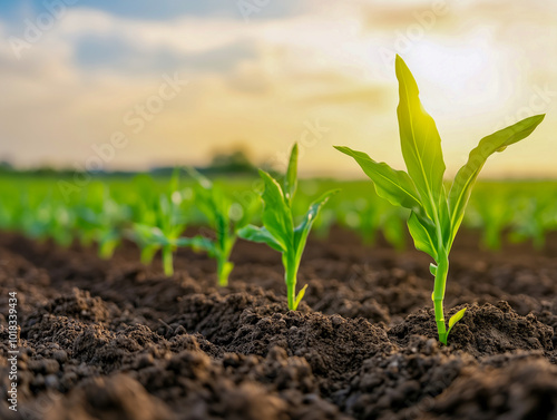 Corn seedlings in field, fresh green maize sprouts on agricultural plantation