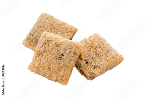 Corn snack. Cereal pads with filling falling into bowl against white background