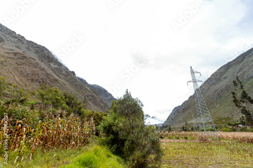 Cornfield with power line tower in a valley of Ollantaytambo, Peru