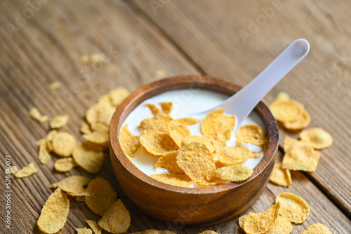 cornflakes bowl breakfast food and snack for healthy food concept, morning breakfast fresh whole grain cereal, cornflakes with milk on table food background
