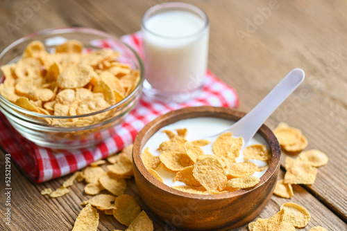 Cornflakes with milk on wooden table background, cornflakes bowl breakfast food and snack for healthy food concept, morning breakfast fresh whole grain cereal