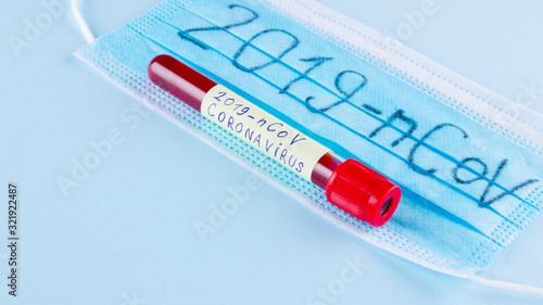 Coronavirus - 2019-nCoV. Test tube with blood identified by the 2019-nCoV coronavirus on blue background. Protective medical mask and syringe. MERS-Cov middle East respiratory syndrome coronavirus