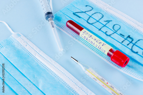 Coronavirus - 2019-nCoV. Test tube with blood identified by the 2019-nCoV coronavirus on blue background. Protective medical mask and syringe. MERS-Cov middle East respiratory syndrome coronavirus