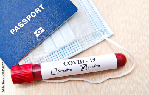 Coronavirus blood test concept. Test tube with coronavirus positive blood over laboratory desk