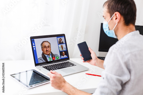 Coronavirus. Man in quarantine for coronavirus wearing protective mask, he's using the notebook. Stay at home. Working on quarantine. Protection. Health care. Video call. Video conference.