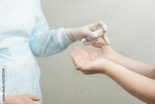 Coronavirus. Nurse, doctor in a protective suit use sanitizer for kid. Preventive measures against Covid 19 infection. antibacterial gel with alcohol-based hand-washing spray. Hygiene concept.