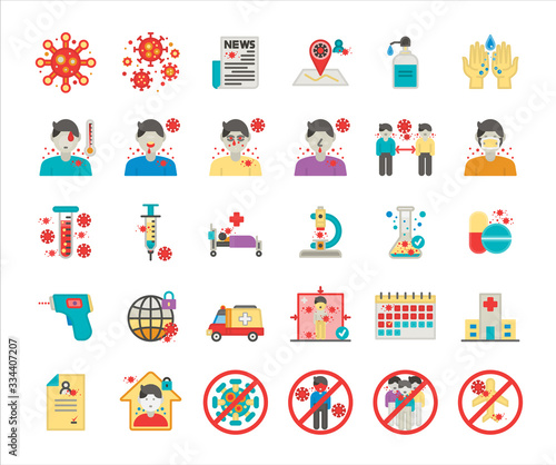 Coronavirus or covid-19 virus icons set for infographic or website. Conceptual sign and symbol created with grids for pixel perfect. Flat icon set.