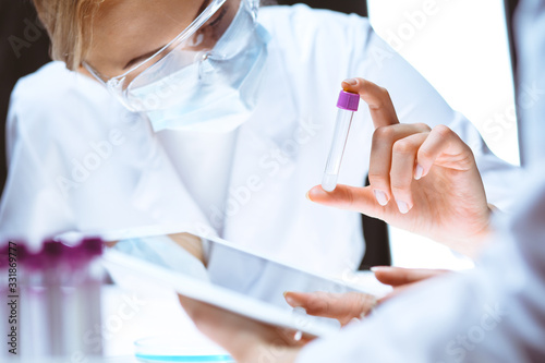 Coronavirus pandemic. Professional female scientist in protective eyeglasses researching tube with reagents in laboratory. Concepts of medicine and virus protection