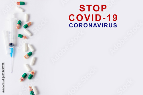 Coronavirus phrase text on a white background with medicines and a syringe. 2019-nCoV. Wuhan, China 2New Coronavirus - 2019-nKoV.