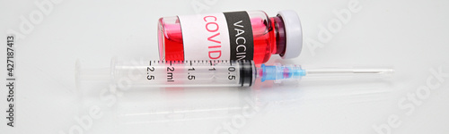 Coronavirus vaccine vial. Nearby lies an empty syringe with a needle