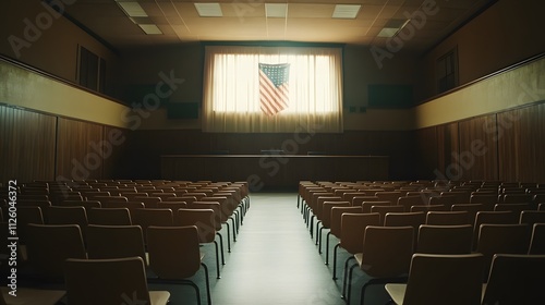 Corporate bankruptcy hearing room filled with solemn atmosphere, legal professionals and stakeholders discussing financial restructuring and future prospects.