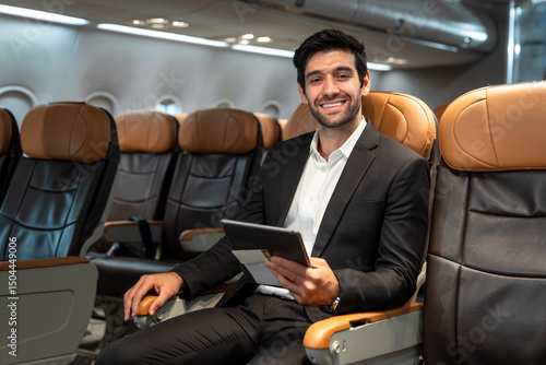 Corporate Businessman in Suit Sitting on Airplane Seat Looking Focused and Relaxed During Business Flight