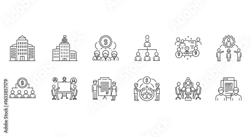 Corporate governance and business management icon set. Thin line vector symbols of finance, strategy, partnership, and teamwork.