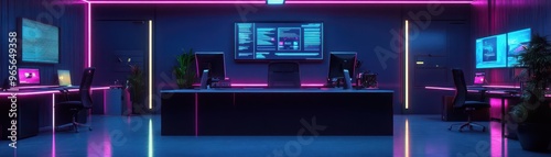 Corporate office where employees interact with 3D holographic business models, Scifi environment, cool neon colors, Highdetail, 3D render
