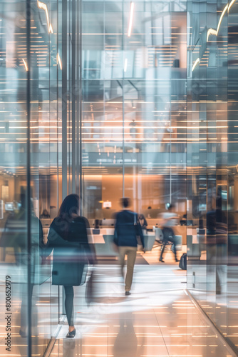 Corporate office, workplace. People moving in the blurry motion behind the glass. High quality photo