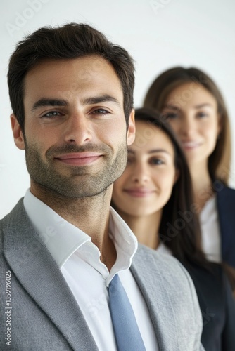 Corporate portrait of three smiling colleagues in a modern office setting, emphasizing professionalism, teamwork and business attire.
