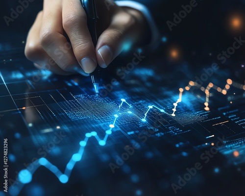 Corporate professional analyzing financial growth, drawing an upward trend line on a digital stock market chart, futuristic business environment, hyperdetailed, high resolution, 8K