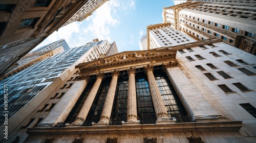 Corporate skyscraper financial institution monumental architecture stone columns business district landmark exterior