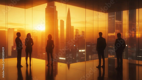Corporate team silhouetted in glass office at sunset overlooking city skyline
