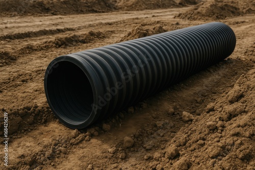 Corrugated Pipe in Soil: An enduring cylindrical conduit of industrial might rests amidst the arid embrace of exposed soil, symbolizing the very essence of infrastructure and urban development.