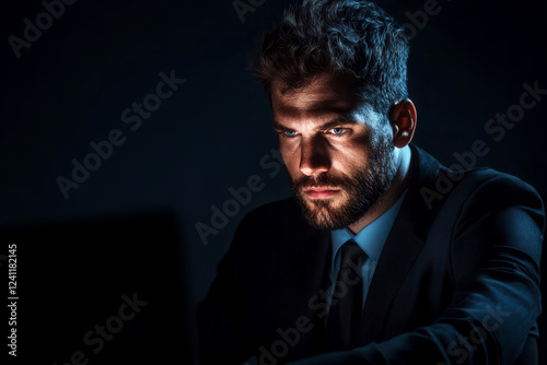 Corrupt employee caught stealing company secrets from a computer, dark office setting, symbolizing insider theft
