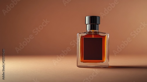 Cosmetic bottle with transparent liquid and blank label positioned on warm brown background, perfect for branding and marketing purposes.
