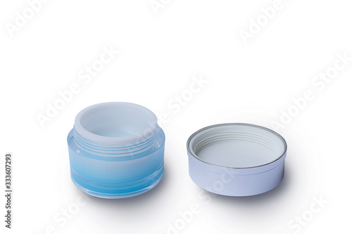 Cosmetic cream bottle isolated white background with clipping path - Blank blue bottle packaging clear cosmetic cream pot and open the lid isolated on white background
