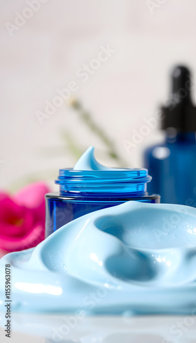 Cosmetic cream texture. Blue face cream, beauty serum, body lotion macro. Skincare beauty product background, blurry foreground, with white tones