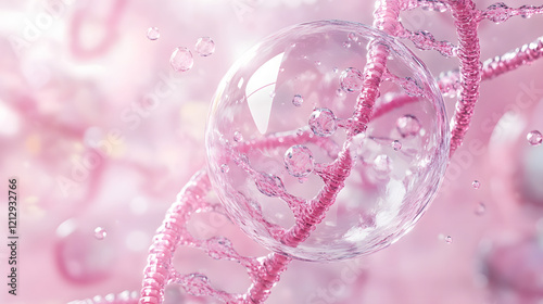 Cosmetic Essence, Liquid bubble, Molecule inside Liquid Bubble on DNA water splash background, 3d rendering