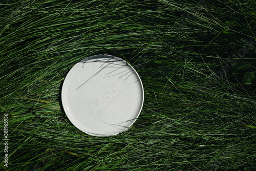 Cosmetic plate in beautiful grass, background for advertising natural cosmetics and ECO products.. Geometric cosmetic display stand. Flat lay, copy space, mocap. Abstract eco background