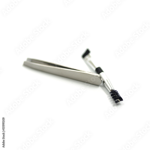 Cosmetic set : spoolie brush, tweezers, angled brush isolate on white background