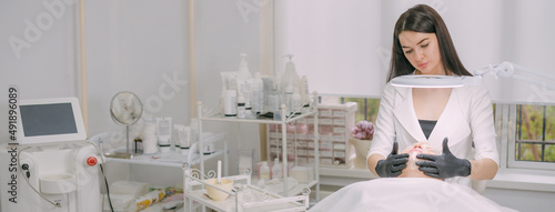 Cosmetologist and dermatologist makes a moisturizing, rejuvenating woman lying patient in a beauty salon.