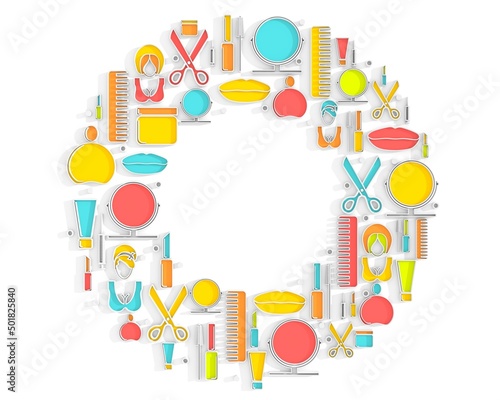 Cosmetology and fashion concept. Template for presentation. Circle frame with thin line icons. 3D render