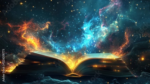 Cosmic book glowing, nebula background, fantasy, magic
