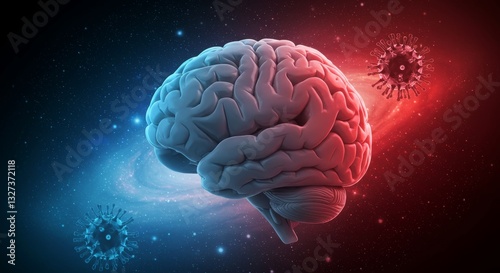 Cosmic Brain: A Neurological Universe - A 3D brain, illuminated in blue and red, floats amidst a cosmic backdrop. The symbolizes intellect, vulnerability, the universe, infection, and mystery