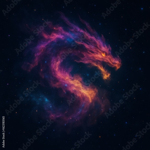 Cosmic dragon nebula with vibrant purple pink and orange gas clouds and distant stars