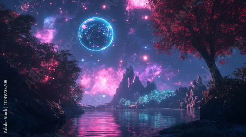 Cosmic Dreamscape: A surreal dreamscape bathed in ethereal light, a glowing blue orb hangs in a sky bursting with vibrant stars.