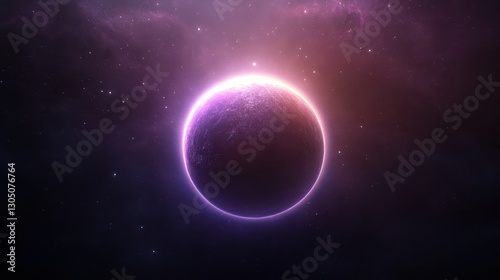 Cosmic eclipse scene, dark celestial orb glowing with vibrant purple halo, illustrating the beauty of astronomical events.