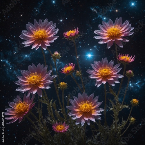 Cosmic flowers with radiant petals floating in outer space with stars around them.